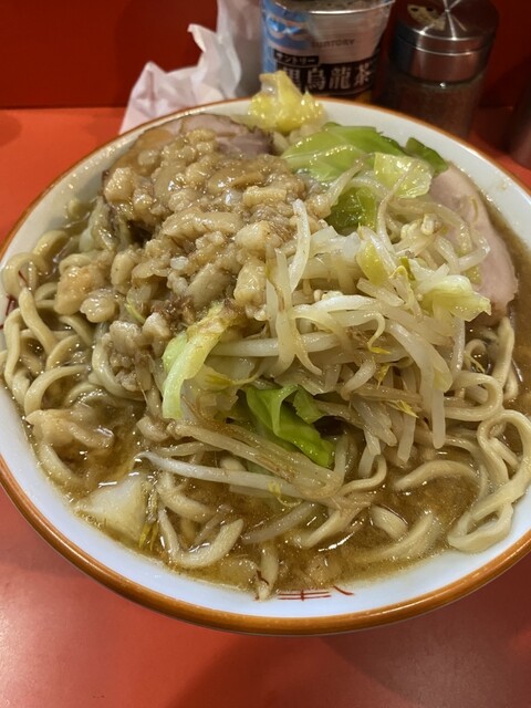 直系埋めモチベ高い流れで、初回訪問の仙川店に来ました。これで7/45です。土曜の17時半くらいに到着し、店前に30名くらいの並びでした。待ち時間は大体1時間くらいです。注文はラーメン(800円)アブラコールにしました。麺量は調べた感じ350gあるようです。味の感想ですが、めちゃくちゃ好みでとても美味しかったです!タイトルの仙川ブラックはそこまでは感じませんでしたが、比較的硬めの麺と激熱の微乳化スープの相性が良く、待ち時間で冷えた身体に染み渡る一杯です。ブタは2枚入っており、程よい脂身と赤身のバランスで最高でした。ヤサイはキャベツ含有量が多く、クタで美味しかったのですが、コールしないと微量しか乗らないのが残念です。次回はヤサイコールしたいなと思います。新潟を除くと初の23区外の直系二郎となりましたが、かなり安いのがびっくりしました。大体1000円くらいするのが最近ですが800円で食べられるというのは最高のコスパだと思いますね。事前に色々調べてたらルールに厳しいと書かれていましたが、私たちも含め前後の2人組も横並びの案内にできるように調整されていたりなど、硬派な中でも優しさがあるような気がしました。麺量は多いですが少なめを食券で購入できますので京王線沿線の方は是非訪問してみてください。