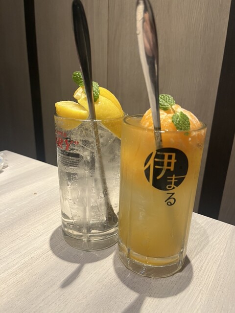 西武新宿駅近く、完全個室と華やかなフルーツサワーが名物の伊まるへ。まずは看板メニューの伊まるのフルーツサワーで乾杯。