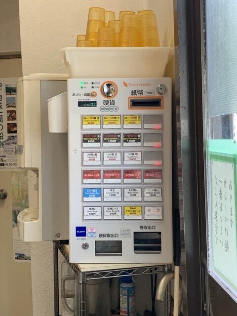 (お水はセルフサービス、紙エプロンは券売機の下にありました)