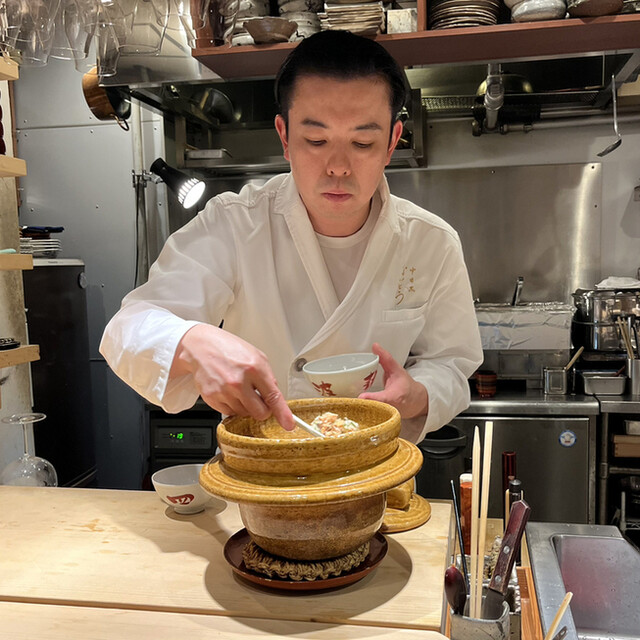 居酒屋が立ち並ぶ中、風格のある店構えの暖簾をくぐるとL字カウンター(7席ほど)に個室が1つ。お料理はアラカルトはなく季節のおまかせのみ。日本酒以外にもシャンパンやケンゾーエステートなどのワインも取り揃えられています。