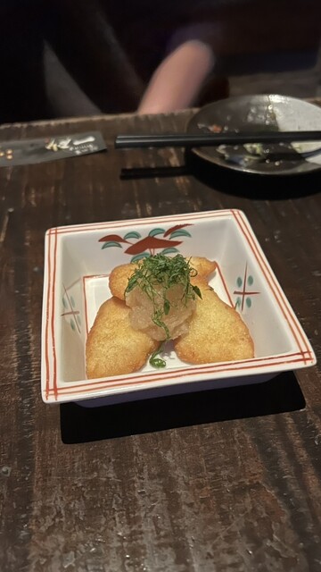国産牛と雲丹の炙りユッケは組み合わせの分かりやすさもあり、少し特別感のあるメニューとして楽しめました。焼き物は味付けが強すぎず、お酒と一緒に食べやすいバランス。銀鱈のカツレツは軽めの食感で、想像していたよりもカジュアルな一品という印象。なんかチキンナゲット寄り。