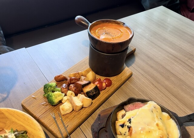 熱々の溶ろけたチーズに南瓜、ブロッコリーなどの野菜やフランスパン付け、口の中でダイレクトに濃厚なチーズのコクとまろやかさが広がり美味しい