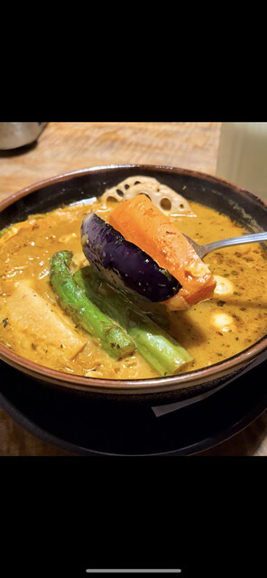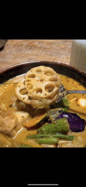 お店オリジナルのココナッツベース、ヨーグルトの酸味と甘味があり、飲むヨーグルト近い味でスープカレーに合い美味しい