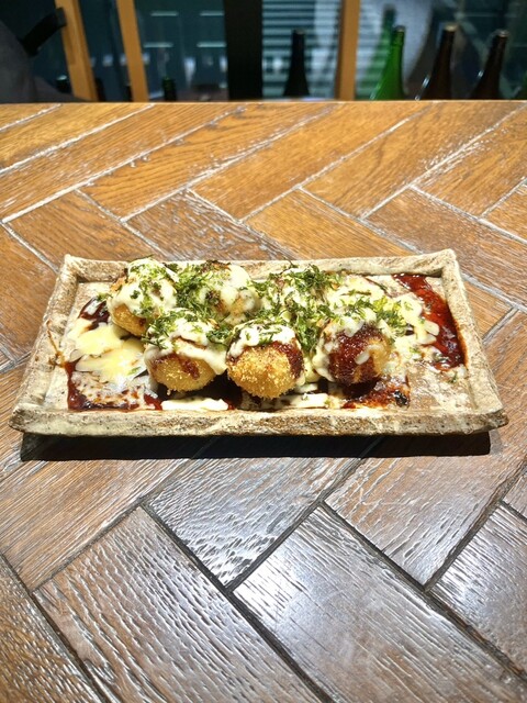 たこ焼き。蕩けたチーズ、マヨソースと青海苔がかかった、たこ焼き風コロッケ、なかなか美味しい。