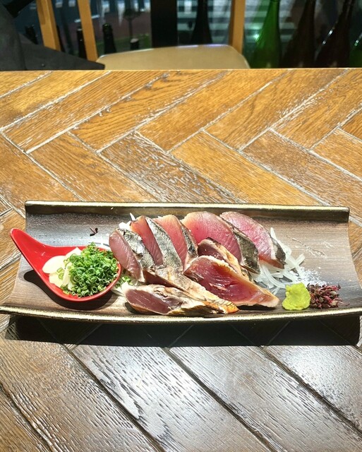 今が旬の土佐清水産のカツオの表面を藁で焼いたお造り。