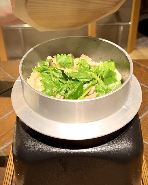 地鶏の濃厚な旨み、鶏肉の脂の甘みも加わり、深いコクがあり、舞茸、えのきの豊かな香りが広がります。米粒一つ一つに味が染み込み、ふっくら優しい味わいで美味しい。