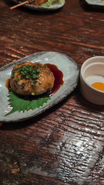 「出ました、名物!『ジャンボ月見つくね』!手ごねのつくねに絡む秘伝のタレ、そして濃厚な卵黄…!とろ〜り絡めていただけば、口の中が幸せでいっぱいです。」