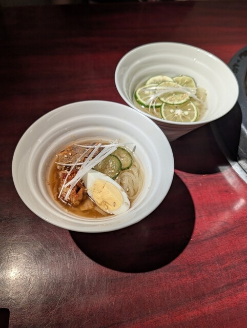 メはこれ! スッキリとしたライムの冷麺と、定番 の冷麺。どちらもサッパリといただける。