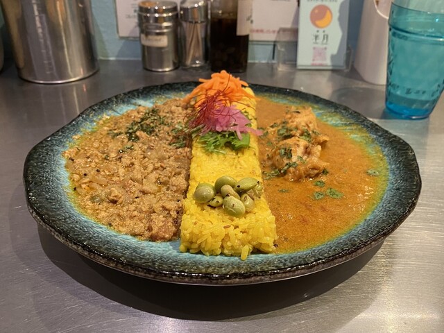 提供されるカレーは「食べるアート」のような盛り付けが特徴で、鮮やかなターメリックライスを中心に、個性豊かなキーマカレーとチキンカレーの二種が添えられています。キーマは深みのある旨味とスパイスが凝縮された濃厚な仕上がり。チキンはホロホロの鶏肉とココナッツミルクのコク、華やかなスパイス感が溶け合った一品です。
