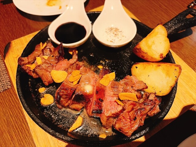 鉄板の上で、肉が完成する瞬間。
