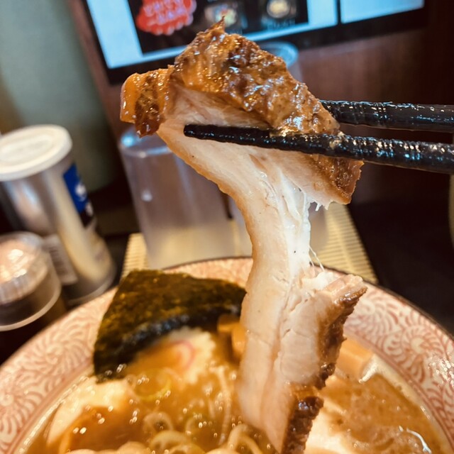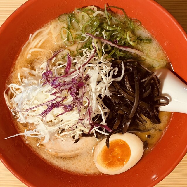 野菜と豚バラの旨みが溶け込んだ、コクのある鶏がらスープに、歯切れの良い低加水細ス...