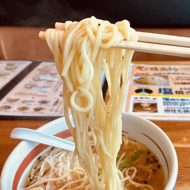 琥珀色であっさり塩味のスープに、歯切れの良いぱっつん系のストレート麺が美味しい。