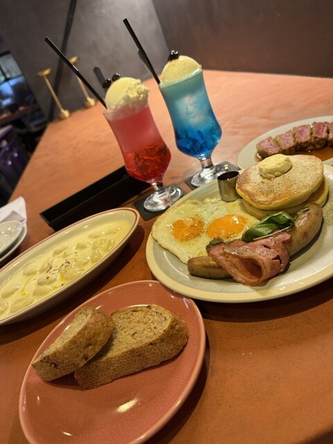 ハムやソーセージと一緒におかず系のパンケーキとして楽しんだり、メープルシロップも付いてくるので甘くしても楽しめて2度美味しいボリューム満点のパンケーキプレート
