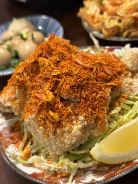 唐辛子のスパイスがかかったインパクト大のの唐揚げ