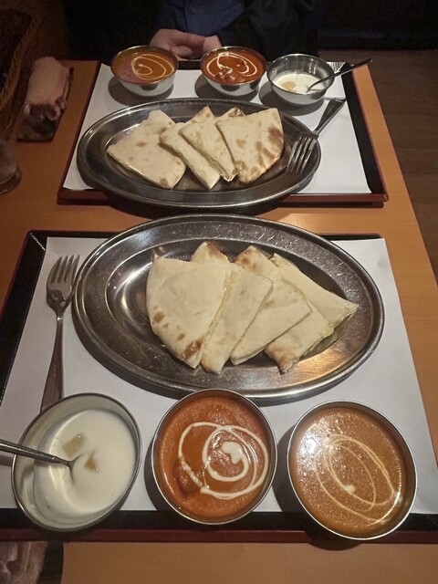 カレー2種(バターチキン、キーマを選択)、チーズナン(+300円)、サラダ、ドリンク(マンゴーラッシーを選択)のセットです!