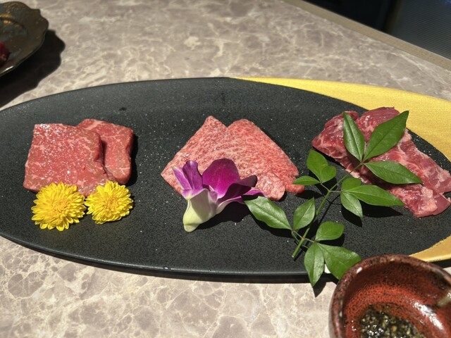 左から内もも、いちぼ、ハラミ。黒い柚子胡椒がついています。これも初めて見ました。内ももは、家でもよくローストビーフに使います。いちぼはやはり優勝です。ハラミも、包丁が細かくはいっており、見た目は長めです。包丁のおかげで食べやすい。