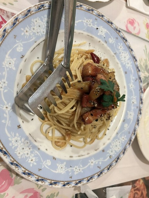 オイルパスタも程よい味わいで油っこくもなく、このベーコンが絶品。少し照り焼き風の味付け。また、店員さんがブラックペッパーをお好みの量掛けてくれる演出も素敵。