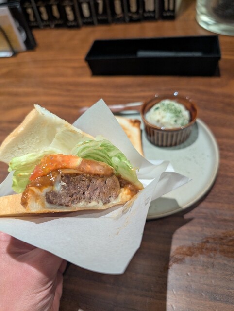 続いて牛粗挽きハンバーグデミチーズが到着。こちらのハンバーグは肉々しく美味しかったです。