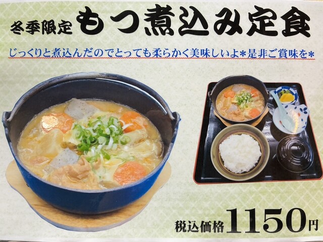 もつ煮込み定食 ご飯大盛り をオーダー^ ^ もつ 大根 こんにゃく ニンジン ゴボウ 生姜 ニンニク を味噌味で良く煮込まれていて