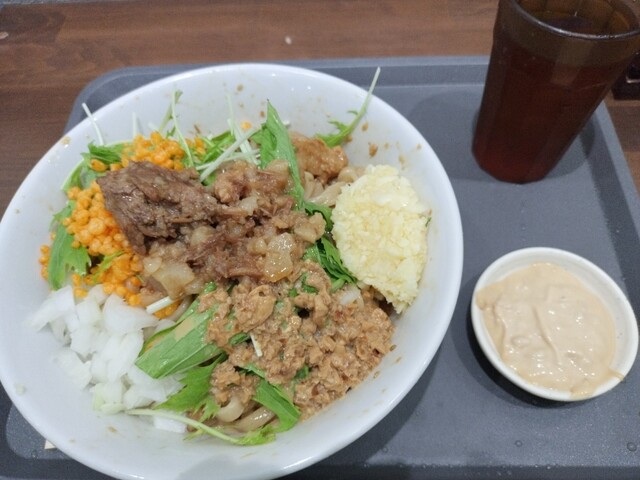夏の暑い盛りにピッタリな冷やしまぜそばをガリマヨトッピングでいただきますシャキシャキやさいにワシワシ食感の麺をガッツリガリマヨで✨食欲の湧かない時でも否応でも高まる食欲で一気に完食ご馳走様でした。美味しかったー✨