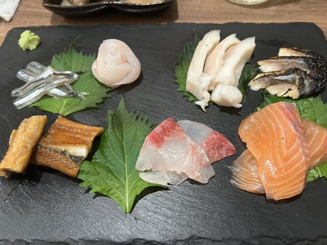 この日の刺身は〈穴子蒲焼き〉〈生サーモン〉が200円、〈石カレイ〉〈ヒラマサ〉〈きびなご〉〈タコ頭〉〈炙り〆さば〉が100円。全部で900円。各2~3切くらいですが安さに驚きです。ちなみに、こちらのおばんざいは『お一人様、各一回まで』のルールがあります。