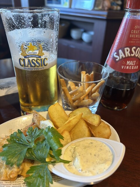 バーテーブルに席を取り、カウンターで「ちょい飲み手帳使います」でビールをもらい、番号札をもらって席へ。ビールをグビグビっとやって、〈グリッシーニ〉をつまんで…〈フィッシュ&チップス〉にはモルトビネガーも付いてくるので、本場イギリス風にポテトフライを食べるのがオシャレ。私はまだまだ違和感しかありませんがw