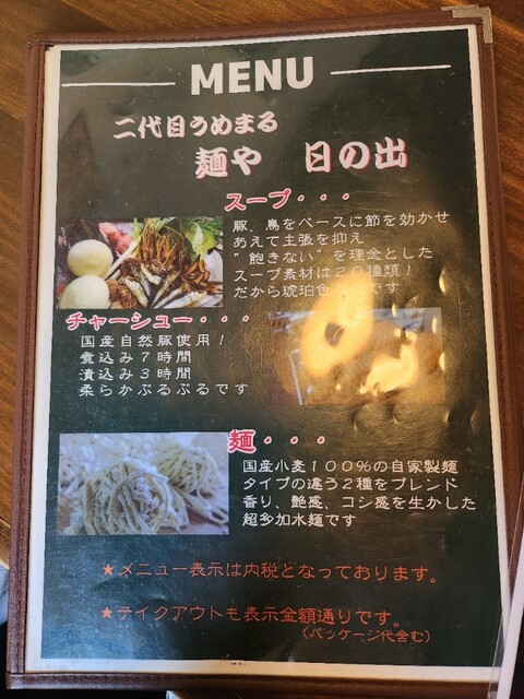 皆さん、こんにちは(^-^)v今回は埼玉県児玉郡神川町にあります、『二代目うめまる麺や日の出』ネーミング長いです(笑)さんに、お邪魔致しました‼️時刻は祭日の勤労感謝の日、日曜日の13時50分です。先客の、お客さまはカウンター1名、ボックスに、4名ほどいらっしゃいました。最近の食べログさんでよく見かけておりましたので、とても気になって保存しておりました。いざ、着席してメニューを見た処、一番人気であろう、うめまるスペシャルは子供に先を越されたので、私は味噌チャーシュー、味玉トッピングをチョイス致しました。早速、着丼しスープをまず、いただくと何ともマイルドな味、もちっとした自家製麺がよく、絡みました。特徴のある麺で一度食べると癖になりそうです。チャーシューもまた、とろける様なインパクトのある味わいでした。つけ麺も人気なようでリピート確実です。夜のお酒も楽しそうでしたし、店員さんも、明るい感じの良いお店で、今後は、夜にも訪れたいと思いました。その節は宜しくお願い致します。美味しかったです。ごちそうさまでした✨