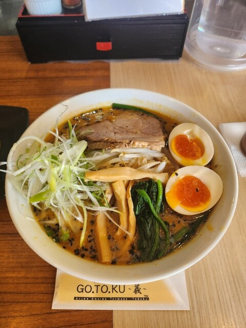 皆さん、こんにちは(^-^)v今回は群馬県伊勢崎市にあります、中華そばGO.TO.KU~義~さんにお邪魔致しました‼️時刻は金曜日の11時15分です。食べログ評価3.52の人気店ですので、並びを覚悟して挑みましたが、大丈夫でした。お客さまはカウンターに1名ほどいらっしゃいました。初めての有名店ですが、SNS で意外な情報がありましたので、ここは意外性を選択し特製味噌そばをチョイス致しました‼️胡麻香るスープ、中太ストレート麺?がよく、共演し、もやし、ホウレン草、ネギも味噌スープによく馴染んでおりました。店内も綺麗な感じ、店員さんもシャキシャキして感じの良さが感じとれますね。お客さんも、後から学生さんがきたり、地元に愛されるお店だと感じとれました。次回は定番のらーめんも食べてみたくなるお店でした。美味しかったです。ごちそうさまでした。(((^^;)