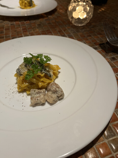 季節のパスタは、かぼちゃを練り込んだ生地で、ほんのり甘みが出ていて優しい味わい。