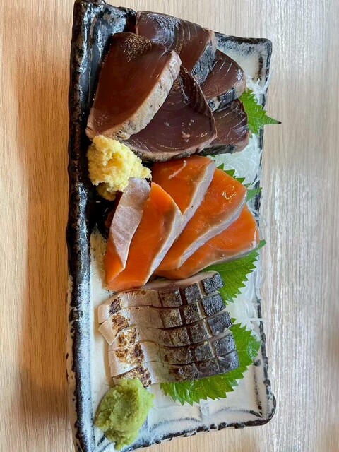 まず印象的だったのは刺身の盛り合わせ。かつおのたたきやまぐろ、サーモンなどが並び、脂のりと旨味のバランスがしっかり感じられます。特にかつおは香ばしい皮目と中の柔らかい赤身のコントラストが心地よく、薬味と合わせることで一層引き立っていました。サーモンは濃厚な甘みがあり、まぐろはあっさりしながらもしっかりとした旨味が口に広がります。