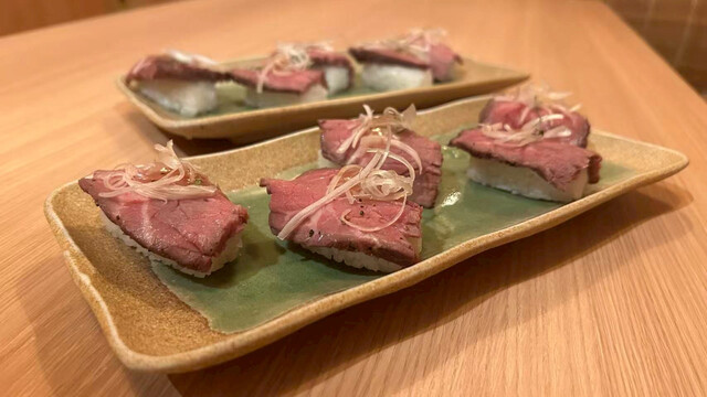 さらに目を引いたのは「牛肉寿司」。薄切りの赤身肉がシャリの上にのり、肉の旨味をダイレクトに感じられる贅沢な一皿。軽く炙った香ばしさとネギの薬味が全体を引き締めてくれます。