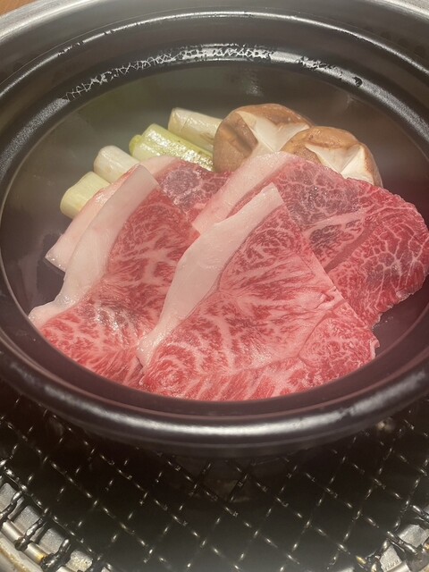 運ばれてきたお肉は、もう見た目から反則級。サシの入り方が美しく、焼く前からワクワクが止まらない。鍋でさっと火を入れる和牛は、脂の甘さが驚くほど上品で、口に入れた瞬間ふわっと溶ける感覚。重さは全然なくて、旨みだけがしっかり残るのがすごい。野菜と一緒に食べることで、肉の甘みがさらに引き立つのも最高。