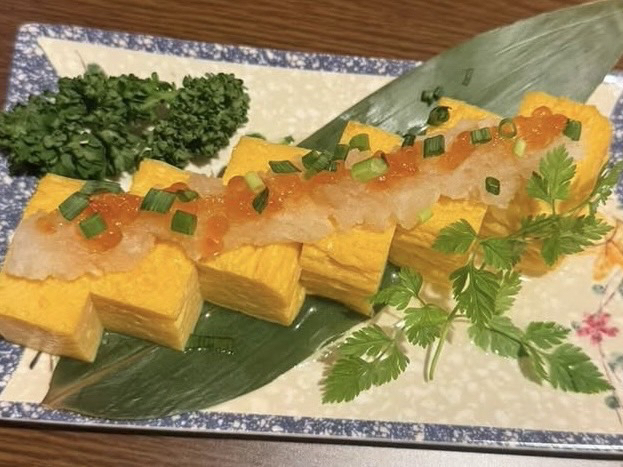 まず運ばれてきたのは、いくらと大根おろしがのった出汁巻き卵。黄金色の卵が角まできれいに焼かれていて、見るだけで丁寧な仕事がわかる。ひと口食べると、ふわっと軽く、中はほどよく出汁を含んでいて優しい甘み。上の大根おろしといくらがくどさを消してくれて、箸が止まらなくなるタイプの出汁巻き。