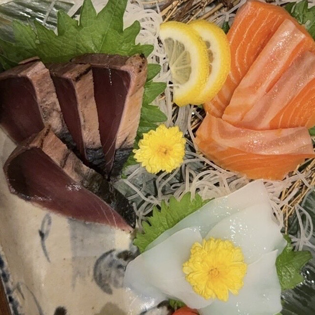 お造りの盛り合わせも印象的。サーモン、イカ、カツオとそれぞれが厚めに切られていて、素材の味がきちんと主役になる盛り付け。とくにイカはぷりっと弾力があり、噛むほど甘みが出て、丁寧に下処理されているのがよくわかった。