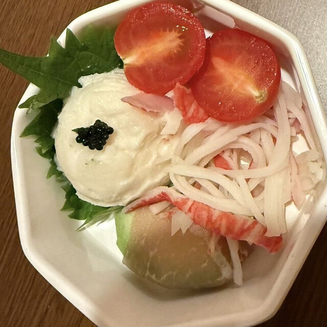 小鉢のポテサラ×カニ×アボカドは、和食店らしい上品な盛りつけ。ポテサラはなめらかで、カニの甘み、アボカドのまろやかさが合わさると一気にリッチな味わいに。そこにトマトの酸味が入ることでバランスが取れて、単品なのにコースの一皿のような完成度だった。