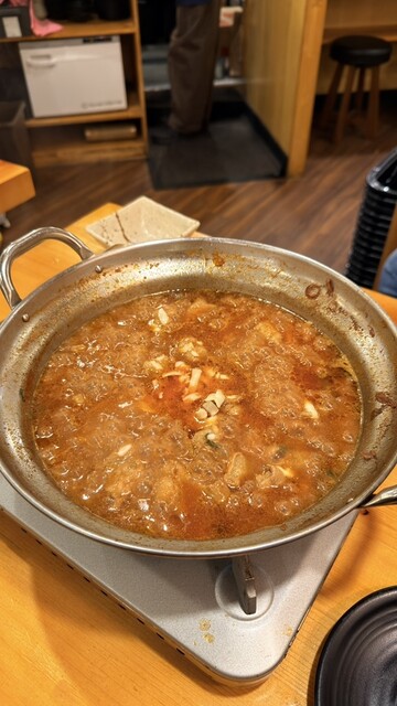 甘辛い出汁が食欲を刺激し、一口目から「あ、これは旨い」となる味。プリップリのもつは臭みもなく、ほどよい脂が出汁に溶け込んで深みのある味わいに。白菜や野菜にも優しく旨みが染みていて、箸が止まらないタイプの鍋でした。