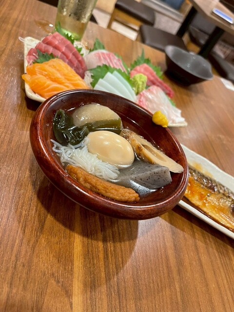 まず、おでんが想像以上にしっかりだしが染みていて優しい味。玉子、こんにゃく、大根、ワカメなど定番がそろっていて、甘すぎないすっきり系のつゆが飲みやすい。