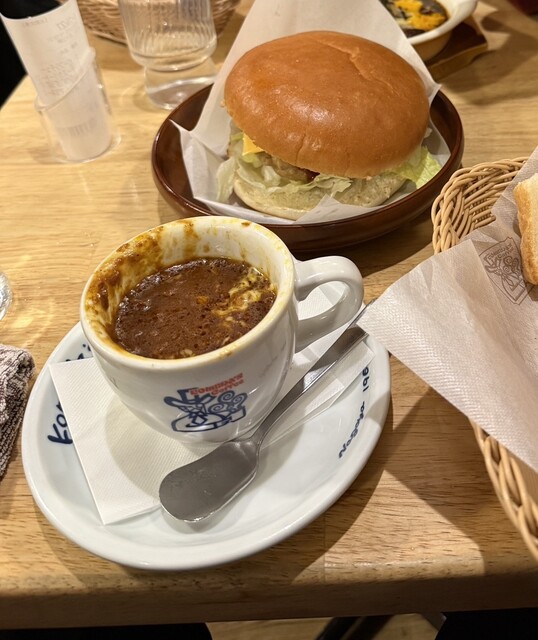 コメダ珈琲でハンバーガーとシチュー、トーストを注文しました。ハンバーガーはパンがふわっとしていて、具材とのバランスがよく、食べ応えがありました。シチューは熱々でコクがあり、パンにつけて食べると満足感が高かったです。全体的に量が多く、ゆっくり過ごしながら食事を楽しめる点が印象に残りました。