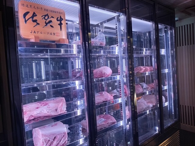 エレベーターでお店の階に着くと、扉の向こうには立派な肉の冷蔵庫が!