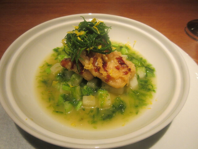 (6) 対馬アナゴのベニエ、淡路島真魚鰹のヴァプールデユクレレ風