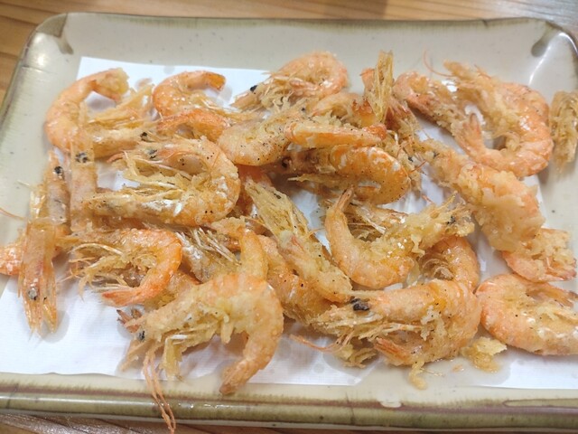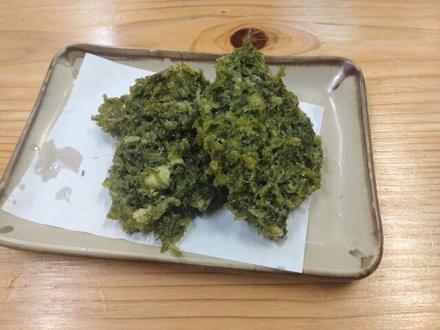 塩と醤油のコンビ、川海老揚げにあおさの天ぷらをオーダーしました。