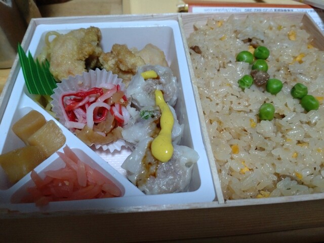 シウマイ3個、鶏の唐揚げ2個に焼きそば入りでした。