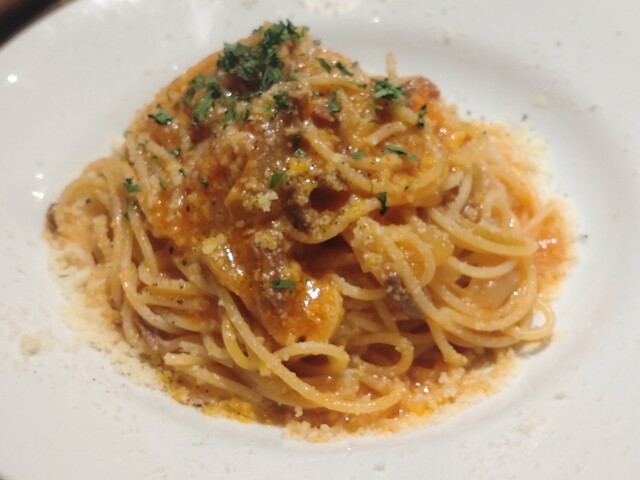 パスタはアマトリチャーナー。タバスコをかけていただきました。美味しかった。