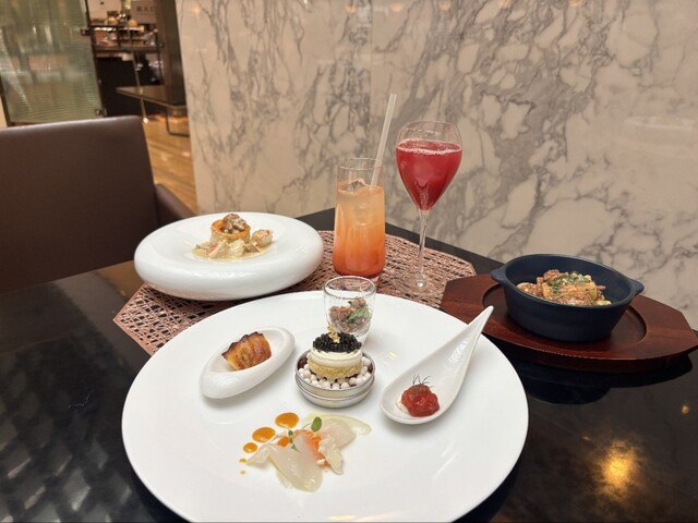 駅前のホテル19階に位置するラウンジ「リバーヘッド」。吹き抜けから光が降りそそぐ、優雅で開放的なラウンジで、プティフレンチ・アフタヌーンティーを楽しみます。フレンチのシェフが手がける、オマール海老やキャビアを使用したミニコース仕立ての華やかなセイボリーに、3種のケーキにパフェ、マカロンやショコラのプティスイーツなど、季節のスイーツも大充実のアフタヌーンティーとのことで楽しみにうかがいました。