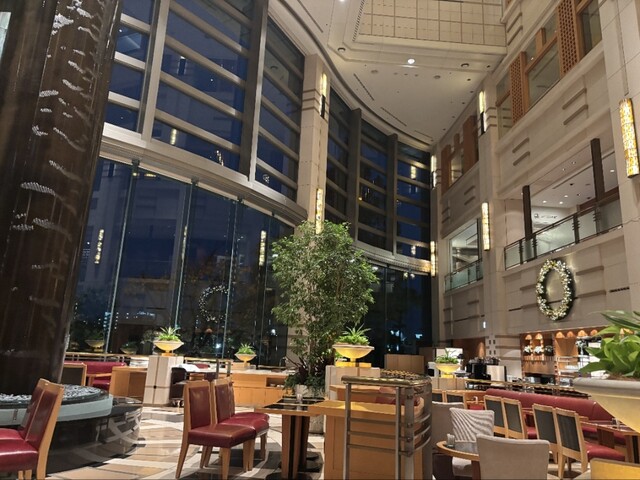 格式のある帝国ホテル大阪、一階のブフェ&ラウンジ 「ザ パーク」にてアフタヌーンティーをいただきます。開放感溢れる店内の入口には今の時期は素敵なクリスマスツリーが飾られています。シックな英国的クリスマスが素敵です。ラウンジでは生演奏も楽しめてとっても優雅な時間を過ごせます。