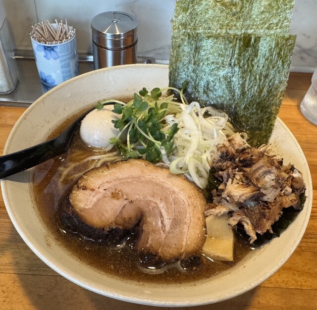 スープを一口!上のスープ層は脂が多く出汁の風味が柔らかく、ふんわりした感じ。そうそう、食べ進めていくと出汁の感じが層に分かれて、味わいが変わっていくんですよ〜。