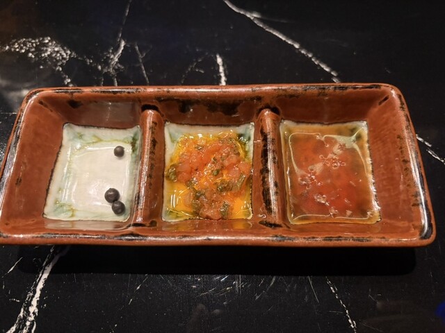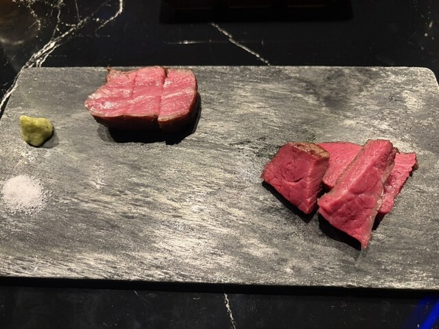 メインのフィレ肉とサーロインは3種類のソースで味わえました。日によってサシの入り方が違うらしく、今回は赤身が多く私的に大当たりでした!ワサビはそのまま食べてもそんなに辛くなく、調味料など細部まで質の高さがうかがえます!