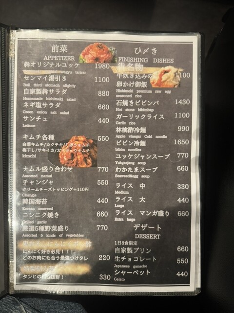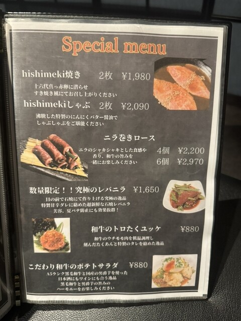 そのあとに続くhishimeki焼きは、卵を絡めることでまろやかさが増し、肉質の良さがじんわり伝わる。ひしめきサラダ、白菜キムチ、ユッケもコースの流れを整えてくれる存在で、濃淡のつけ方がとても上手い。