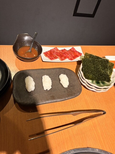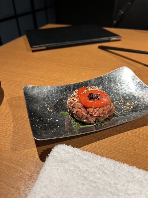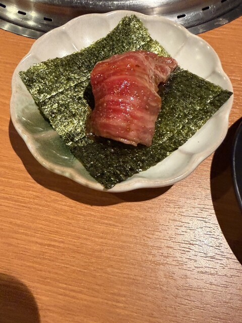 まずは南瓜のポタージュ。焼肉コースの入口とは思えないほどなめらかで、胃にすっと馴染む優しい一皿だ。そして続く“炙り手巻き肉鮨”は、実は今回が初体験。肉鮨そのものを食べるのが初めてだったので少し身構えていたが、炙りの香り、海苔の香ばしさ、肉の甘さが重なるバランス感が絶妙で、一口目からすぐにその魅力に引き込まれた。初めての一皿で“なるほど、これは人気になるわけだ”と素直に思えた。