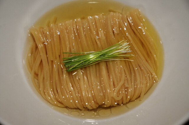 コースの締めには澄んだチキンコンソメのスープに自家製麺を合わせた“鶏そば”が登場。ラグジュアリーな余韻を残す一杯として定評があります。